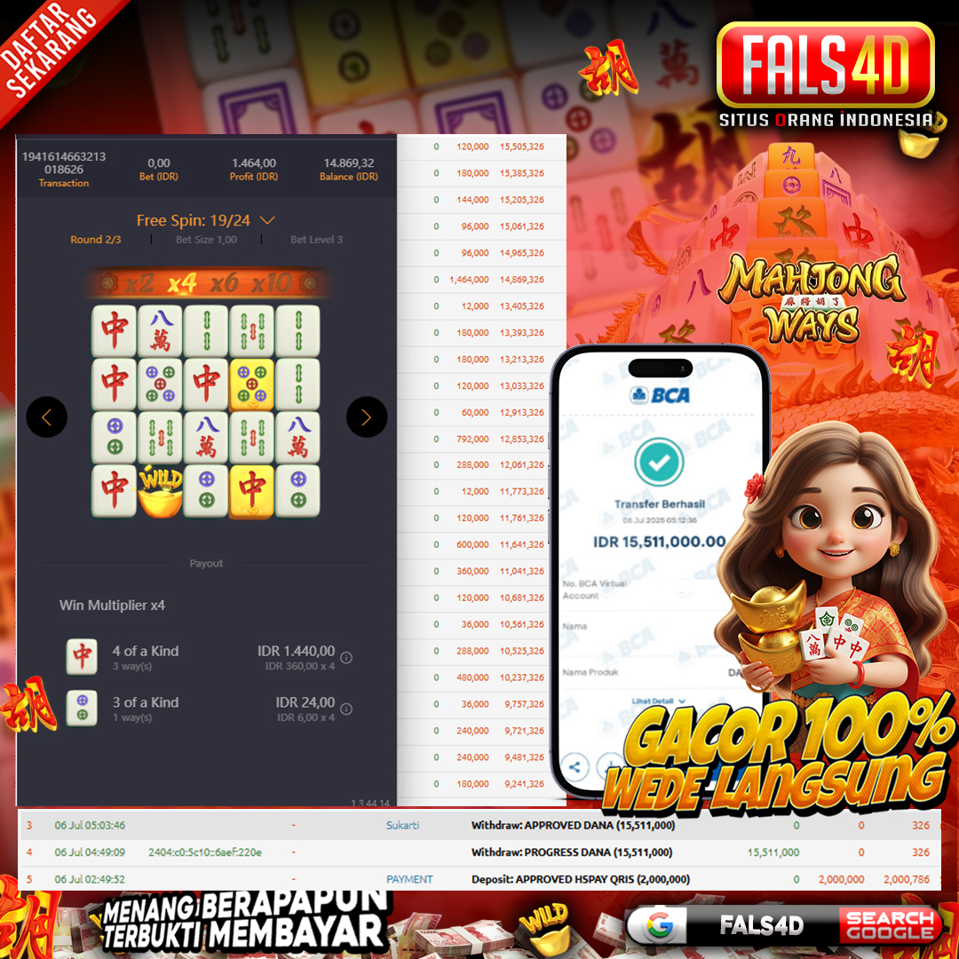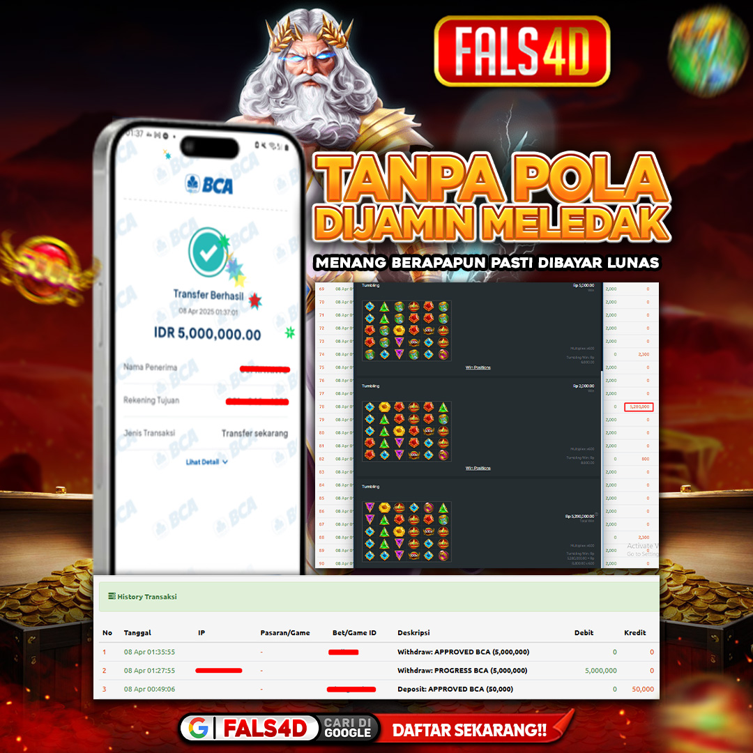Kemenangan ID Med**** ini bisa menjadi motivasi bagi pemain lain untuk terus bersemangat dalam berburu jackpot. Dengan modal terjangkau, strategi yang tepat, serta memilih situs slot gacor seperti FALS4D, peluang meraih kemenangan besar selalu terbuka lebar. Jadi, buktikan sendiri keseruannya dan nikmati pengalaman bermain di FALS4D, situs slot gacor terpercaya yang selalu membayar kemenangan member setia.